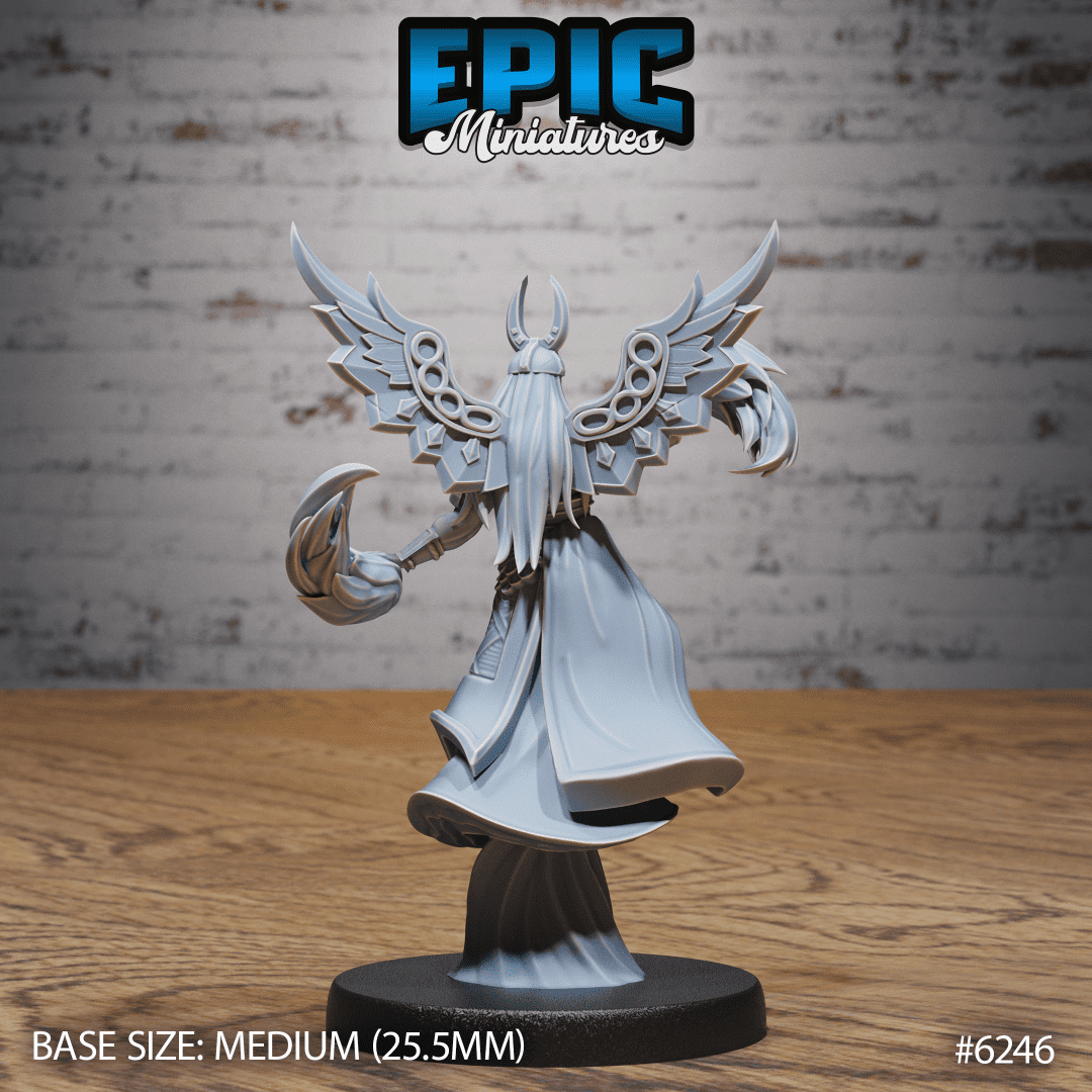 Aasimar Deva Magic stands as a striking fantasy miniature, ready to lead your party or oppose it in equal measure. The figure features broad, angular wings that flare behind a robed, ceremonial silhouette, with layered plates and circular cutouts adding an almost heraldic feel. A horned crown sits atop a veil of hair, while a curved, claw-like weapon arcs from one hand and a swirling aura hints at the other. The robes flutter around a compact base, scaled for 28-32mm tabletop miniatures.