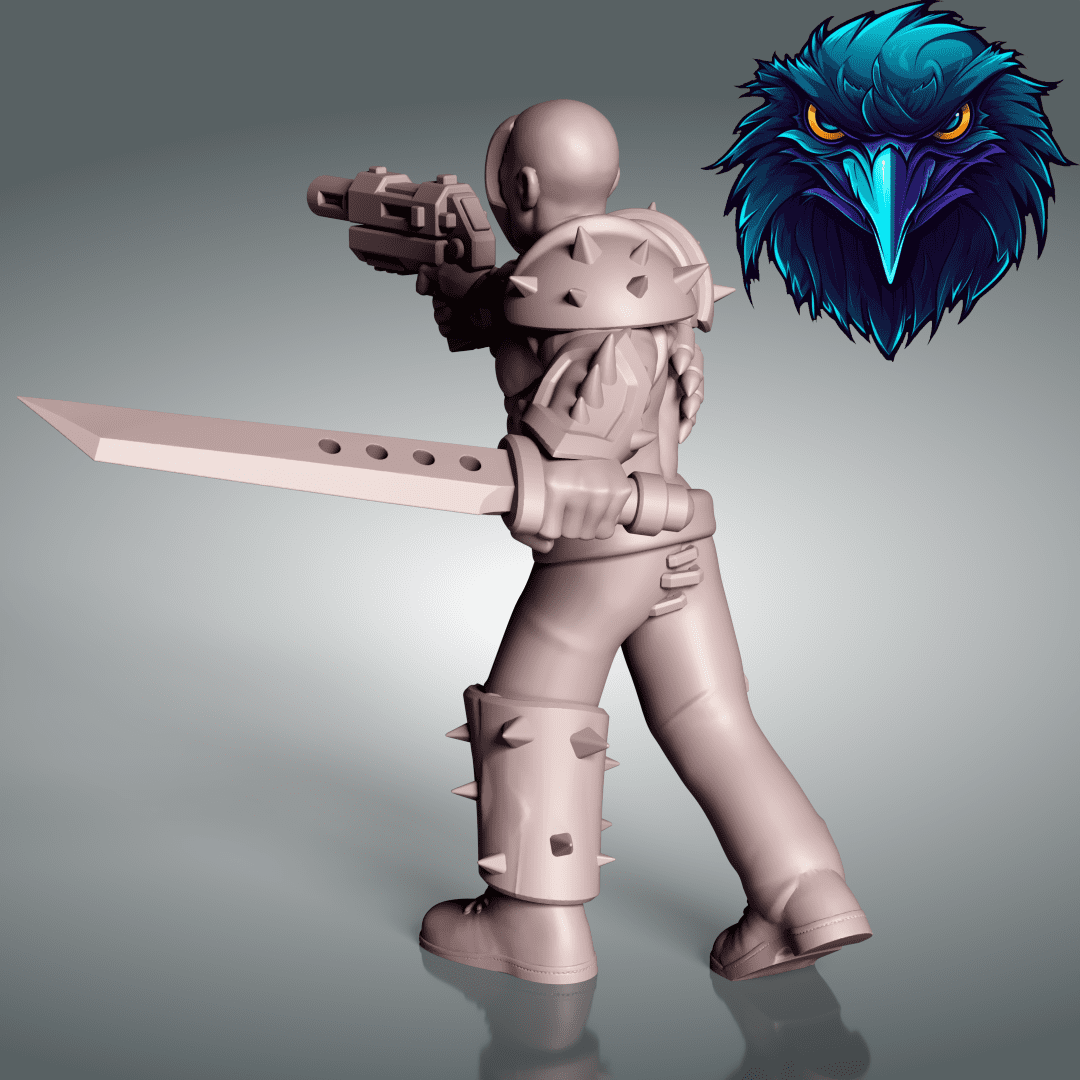 Cultist from the Followers of Change is a 28–32mm grimdark sci-fi miniature that cuts a ruthless figure on the table. Designed for tabletop miniatures, this 3d printed miniatures option brings the harsh creed to your table. The sculpt shows a muscular operative in spiked shoulder armor, a helmet with circular vents, a bandolier across the chest, and heavy boots. In one hand he fires a compact pistol, while the other wields a long, perforated blade that hints at brutal close-quarters carnage. The pose is balanced and ready to charge, capturing the fanatic fervor of his faction.