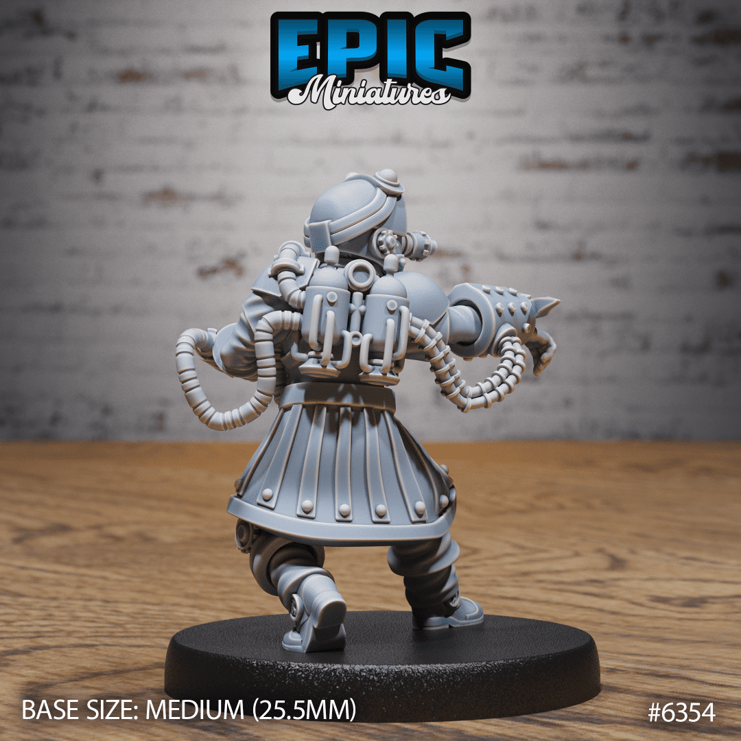 Enhanced Sharpshooter is a bold, steam-tech fantasy miniature posed in a ready-to-fire stance. The figure wears a riveted coat, a hooded helmet with goggles, and twin hoses running from a backpack to articulated gauntlets. A chunky energy rifle is held forward, its knobs and studs catching the light. The cloak and boots imply quick, precise movement across tabletop miniatures on a round base.