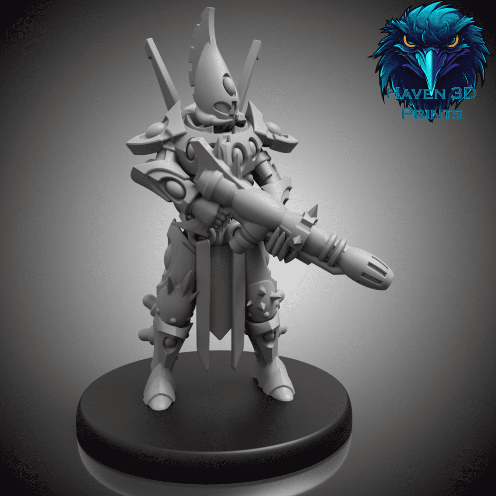Forest Rifle Ranger, a resin, 3D-printed figure from the Blades of the Forest faction, exudes sci‑fi grit and grimdark mood. Its angular silhouette, forest-camouflage armor, and glowing tech accents make it a commanding centerpiece for Grimdark Miniatures on any table.