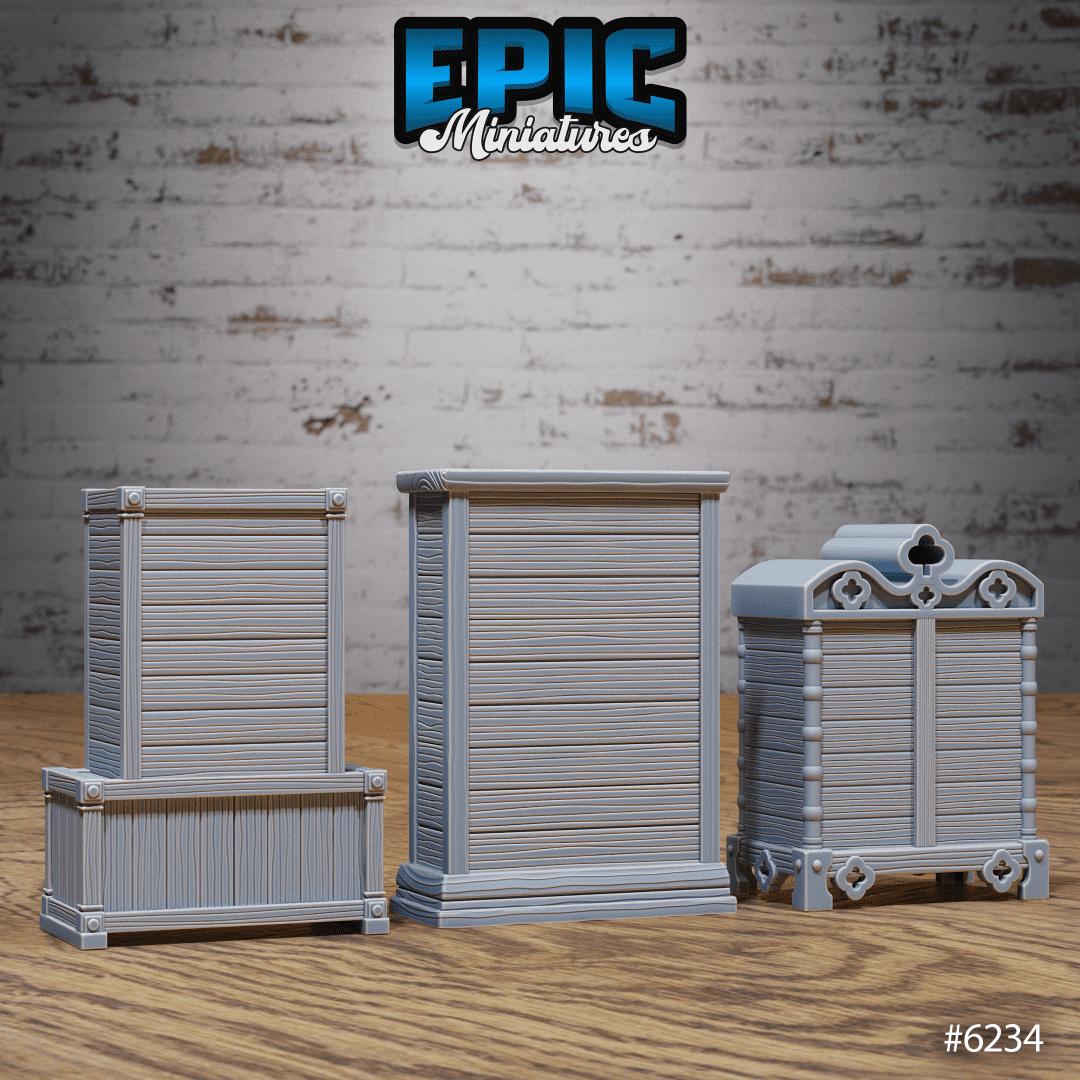 In use, the three pieces create varied sightlines and environments: the central cabinet can anchor a library scene, the left unit offers visual depth with open shelving, and the lattice-backed piece adds a decorative risk-reward element as a light cover. They work well as dungeon dressing, environmental features, or objective-marker scenery within your Tabletop Terrain setup.