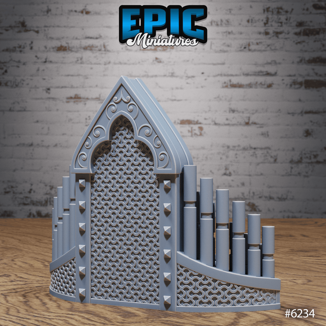 Heavenly Scatter p5 is a compact fantasy terrain piece that evokes a ruined cathedral, featuring a tall pointed arch carved with swirling scrolls, a central doorway framed by organ-like pipes, and curved steps leading up to the focal area. Ornate lattice panels line the base, while tiered plinths and cylindrical towers rise along the sides for a dramatic silhouette on the table. This 3D Printed Terrain brings a solemn, celestial vibe to any scene, designed for 28-32mm play. Tabletop Terrain aesthetics give it a timeless, readable look on the board.