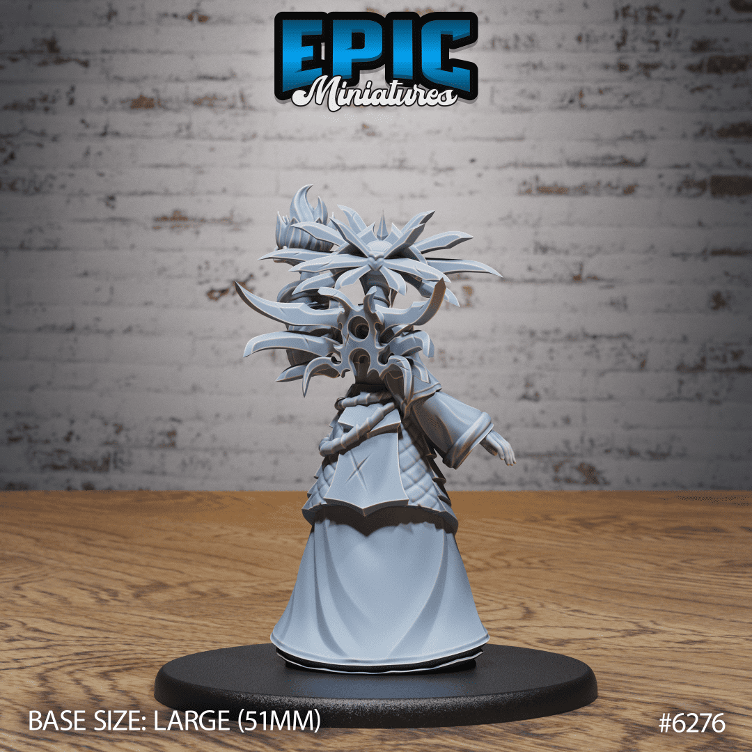 Lady of Pain Magic is a striking fantasy miniature that commands the table with a sorcerous glare. She wears layered robes and angular plate accents, with a radiant headdress of leaflike blades fanning from her head. Her right hand rises to cradle a flame-like orb, while her left rests near the folds of her cloak. The sculpt captures flowing robes, sharp lines, and an imposing silhouette that reads clearly in resin and light, a perfect centerpiece for tabletop miniatures.